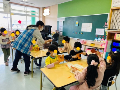 「どんなお顔にする?」「かわいいね!」とお友だちと相談しながら楽しく作れました💕
