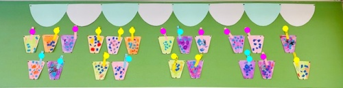 色とりどりのジュースを作りました🍹ジュースの中にはハサミで切ったフルーツが入っています✂