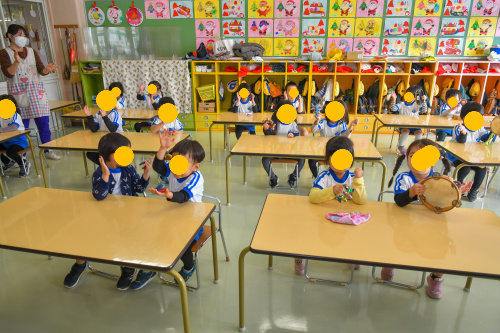 タンバリン・カスタネット・鈴の中から好きな楽器を選んで合奏します🎵優しく鳴らすととってもキレイな音がしますね💕まずは持ち方を確認して楽器ごとに鳴らし方の練習をしましたよ✨最後は曲に合わせてみんなで楽しく合奏しました😊