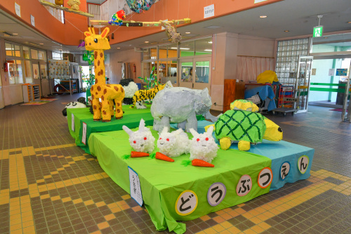 ホールには「どうぶつえん」をテーマにした共同作品が飾ってあります🐼🦒🐘今回の参観週間に向け、各クラス色々な素材を使い、好きな動物を作りました✨