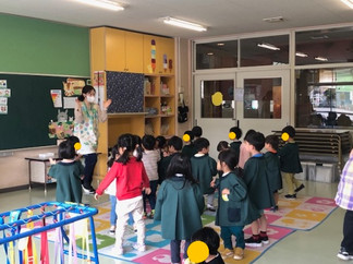 歌いながら先生の真似っこをして手遊びをしていました👏小さなおててを上手に動かしてとってもかわいいですね🥰手遊びの次は先生が音楽を流してくれました🎶なんの曲かな?とみんなわくわく🌟曲を聞いてみんな大喜び😆