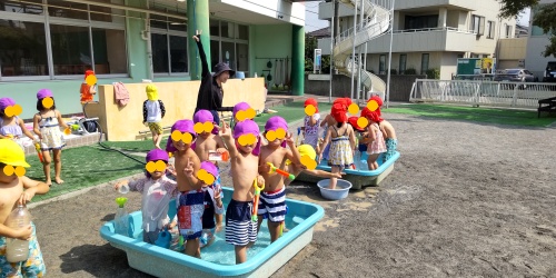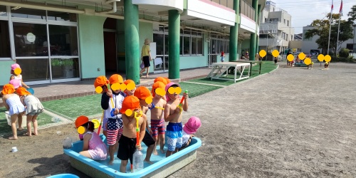 年中組は水遊びを行っていました。今日は登園した順に水着に着替えて、色々なクラスのお友だちと水鉄砲やカップにお水をためて盛り上がっていました。本日で水遊びは終了となります
