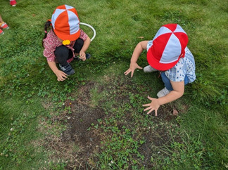 お砂場ではプリンやケーキを作っているお友だちが「見て、見て!」と大きおな声で見せてくれましたよ💖 シロツメクサを摘んでいるお友だちもいました☘