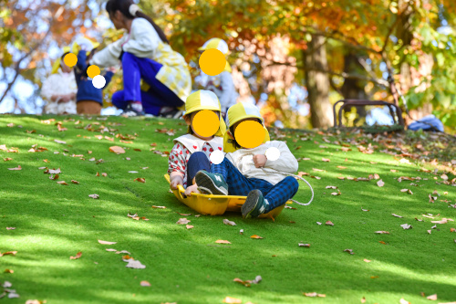 わんぱく森では芝滑りの前に、みんなでおしりペッタンで滑ってみました💖