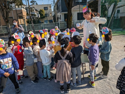 その後クラスごとに園庭にいる色々な鬼に豆をまきました。みんなが作って使用した鬼のお面と三方,お豆は本日持ち帰りましたので、節分の日に是非ご活用くださいね🌟